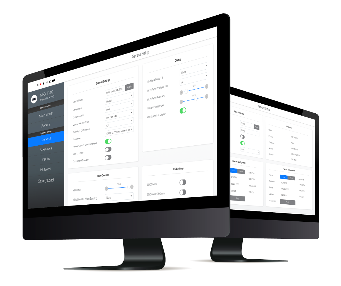 Anthem Web User Interface is now built in to all MRX Receivers and AVM Processors. Using a phone, tablet or laptop, owners can easily access any function or setting and make changes on the fly. Power the main or second zone on and off, adjust volume, change audio modes or tweak channel trims for a perfect surround sound experience. Web UI can also be used to calibrate speaker delays and levels and configure network settings/control options. Source devices can be renamed, simplifying set up by enabling the elimination of unused inputs. Installers can import and export files to make remote management simple and convenient.