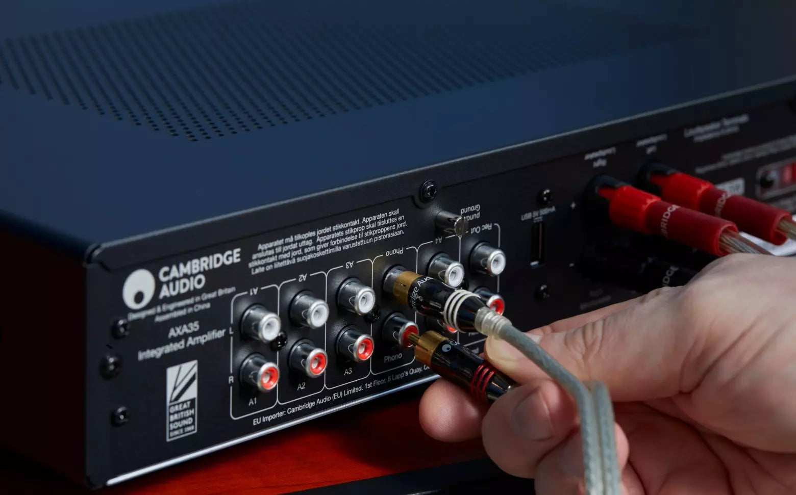 AXA35 is a well-connected amp, with no less than 4 pairs of RCA inputs, plus a pair of phono sockets for a turntable and a pair of recording outputs. There’s a rear USB socket for technical upgrades. Hi-fi quality speaker binding posts (connectors), compatible for banana plugs, mean that thick cable connects securely for an authentic sound.