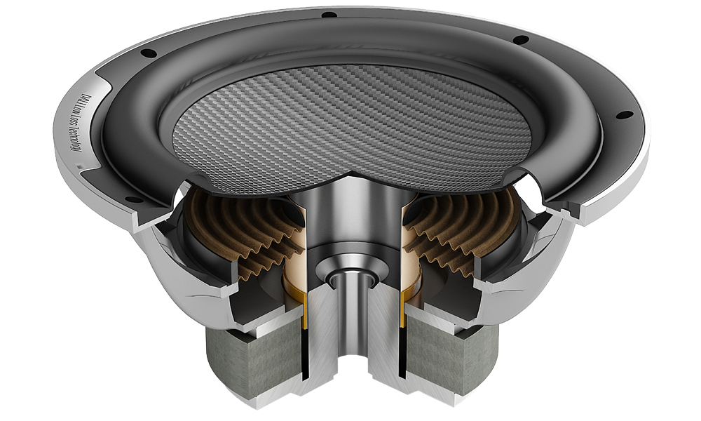 The two side-mounted passive woofers share much of the same technology as the active driver. The cone geometry and carbon fibre material are identical to the down-firing woofer, while the 'upper' part of the chassis, with 10 legs and suspension, is also the same. Unlike the active driver, the passive units only include one spider and of course no voice coil or magnet system. The purpose of each passive radiator is to emulate the movements of the active woofer and to achieve the same tonal balance – something which we've spent hundreds of hours perfecting.