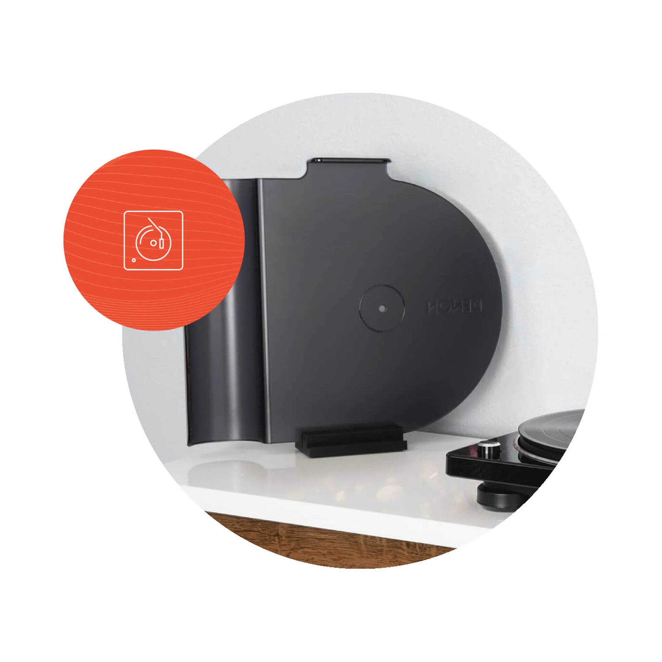 Removable dust cover features a modern design, elevating the overall aesthetic of DP-450USB while eliminating vibration issues that affect music quality associated with attached covers. Doubling as a display stand for your album cover, place the dust cover upright on the included base and show it proudly to friends and family.