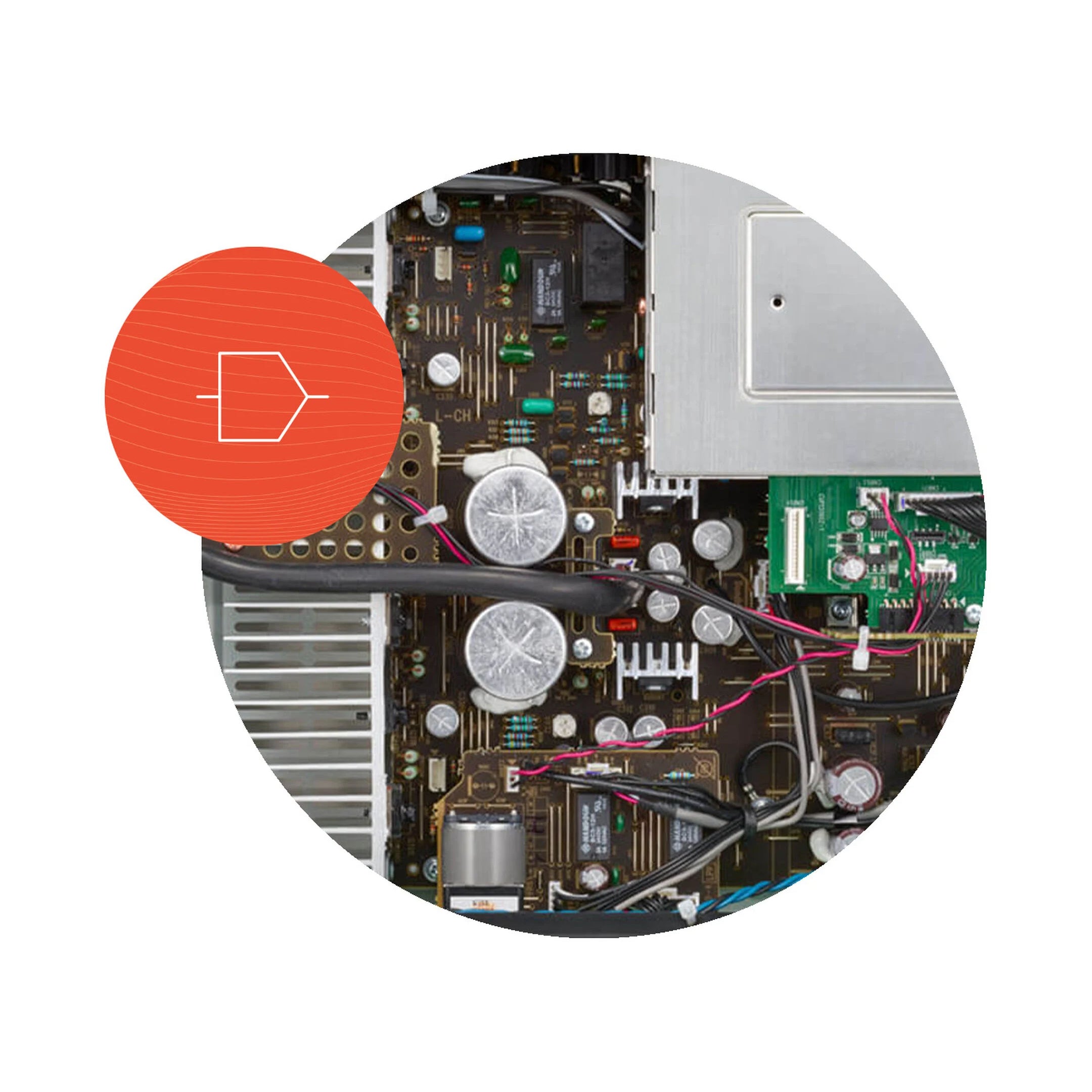 The PMA-600NE includes a phono equalizer that supports playing from sources with a MM cartridge. This phono equalizer has high gain, and unlike loops in other circuit board patterns which cause adverse effects on sound quality, the simple, straightforward design, significantly improves sound.