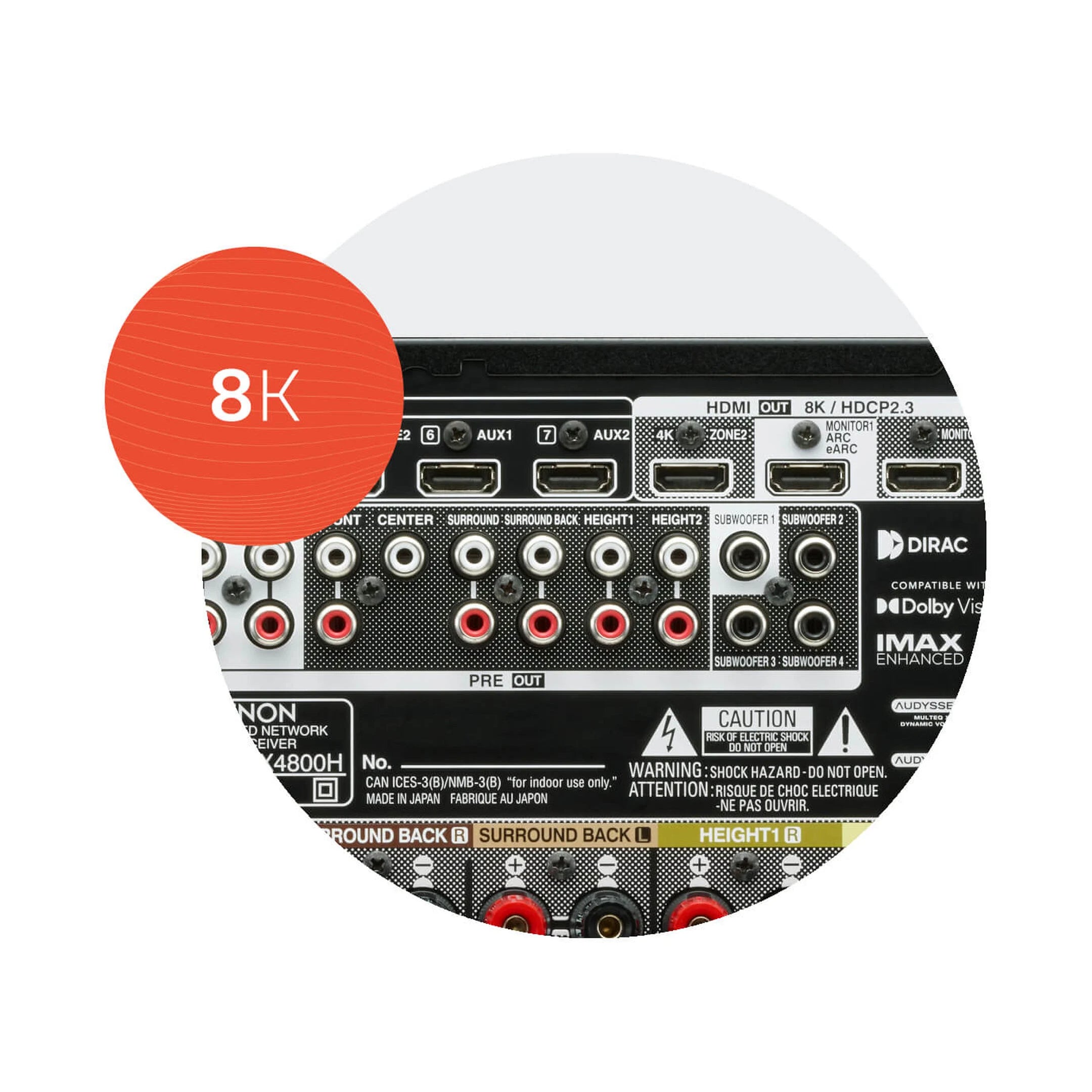 8K video is supported on all seven HDMI inputs and two of the three outputs. With HLG, HDR, Dolby Vision, HDR10+ and Dynamic HDR pass-through, there’s no need to worry about video compatibility or picture quality.