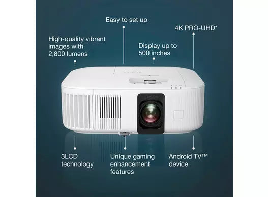 Make your home centre stage for all the action with this 4K PRO-UHD projector and gaming features. Android TV™ means you can easily stream and cast entertainment to a smart and flexible display solution. Sharp images deep blacks and smooth movement, plus great connectivity, easy set-up and alignment make this projector the ultimate choice for all home entertainment.
