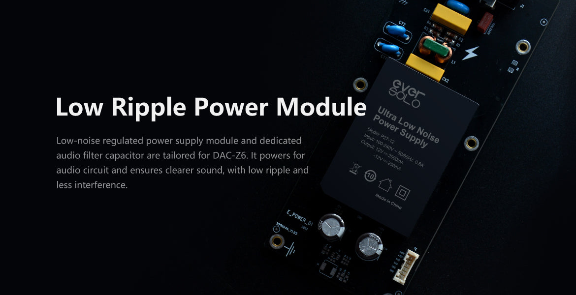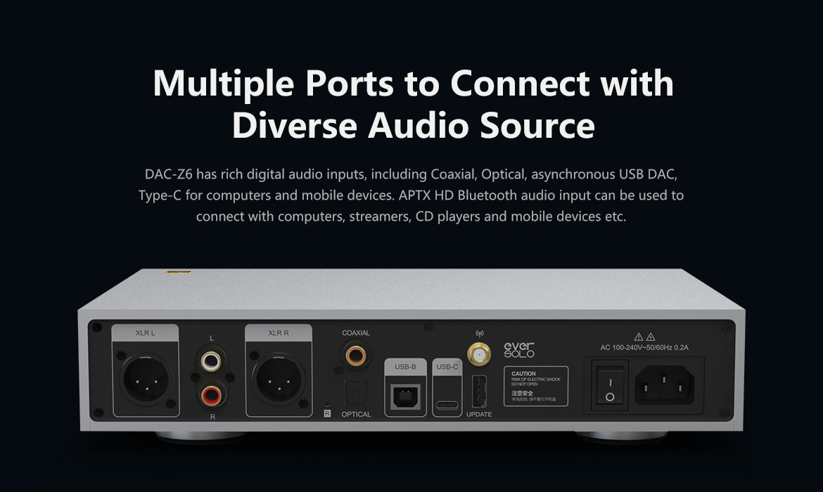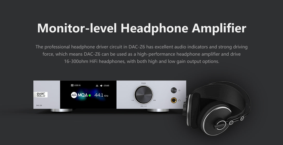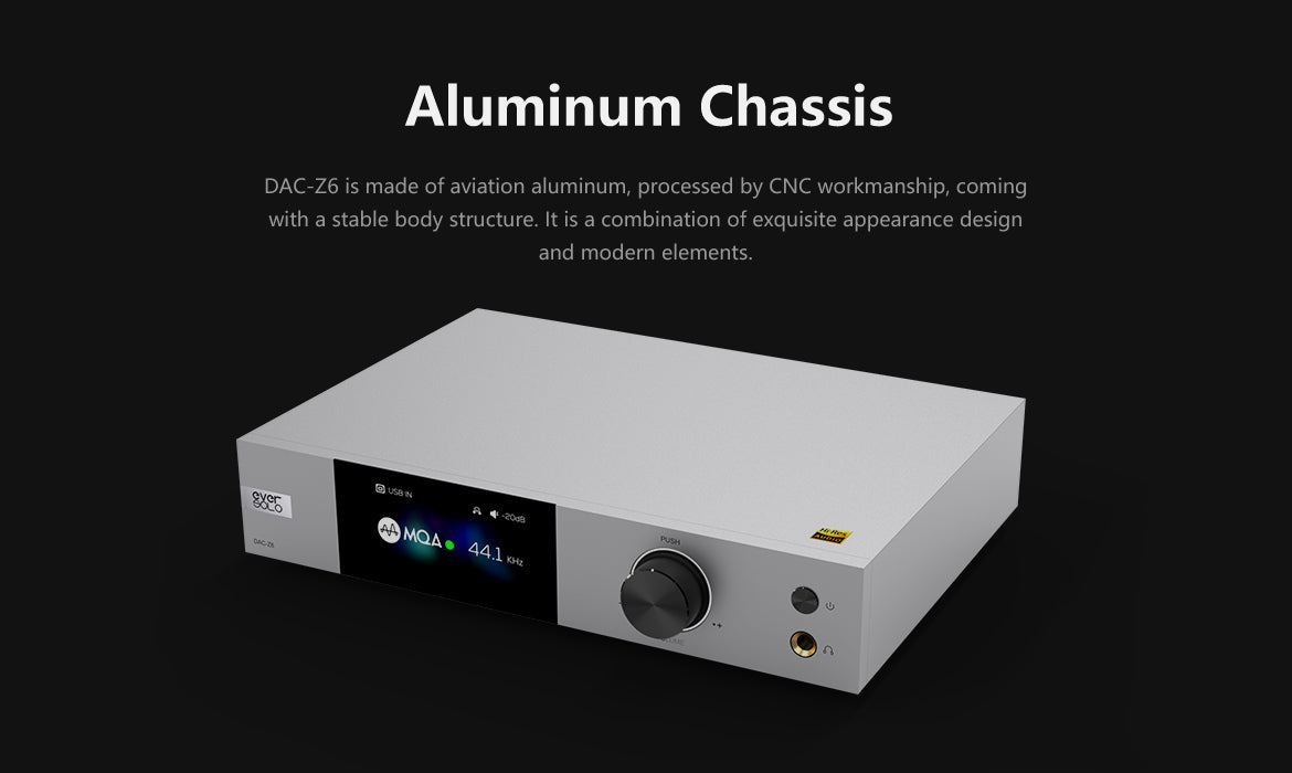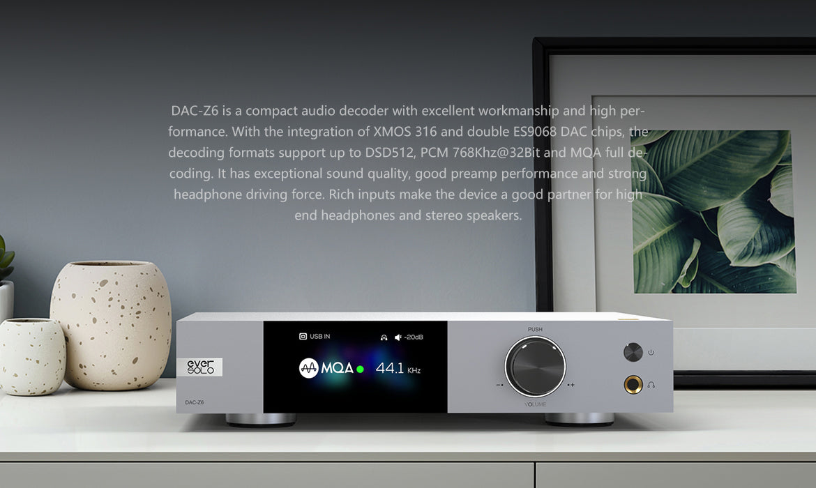 The Eversolo DAC-Z6 is a high-fidelity digital-to-analog converter and headphone amplifier designed to deliver exceptional audio performance. Its compact and elegant aluminum alloy chassis houses advanced components and features aimed at audiophiles and discerning listeners.