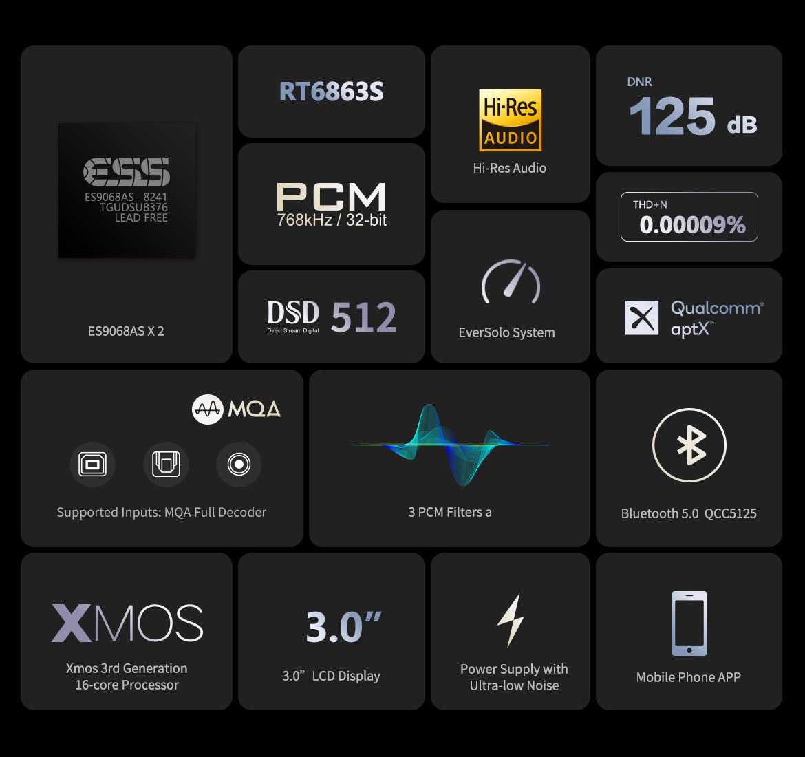 Compatible with Windows (7, 10), Mac, Android and IOS Up to stereo DSD512, PCM 768KHz 32Bit, MQA