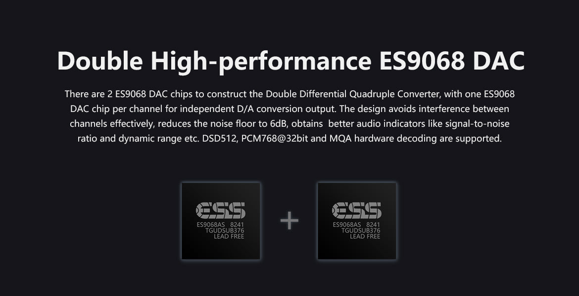 - Dual ES9068 D\A converter chip, independent decoding for dual channel.