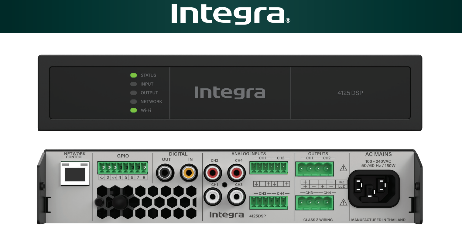 The Integra 4125DSP is a professional-grade 4-channel DSP (Digital Signal Processing) amplifier, designed for high-quality audio distribution in commercial and upscale installation environments such as restaurants, bars, offices or custom residential systems. It combines Class-D efficiency, precise DSP tuning tools, and integration-friendly controls to deliver reliable, flexible sound performance. The unit supports multiple speaker configurations, network control, and built-in DSP presets for easy setup and sound optimization.