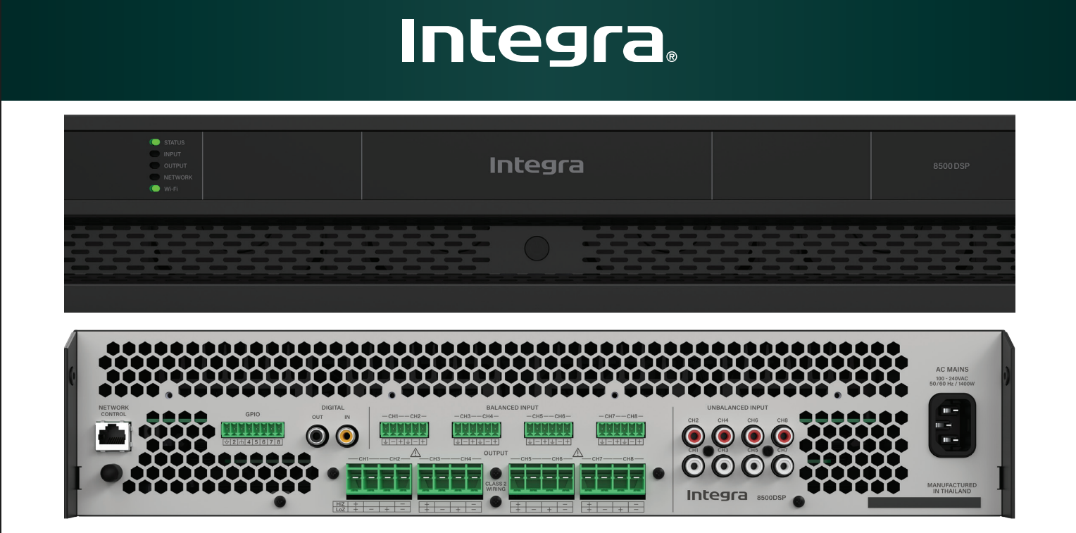 The Integra 8500DSP is a high-performance multi-channel amplifier designed for custom installation and professional audio setups. It delivers clean, powerful sound with advanced DSP control, making it ideal for large homes, hotels, restaurants, and commercial spaces that require reliable, zone-based audio distribution.