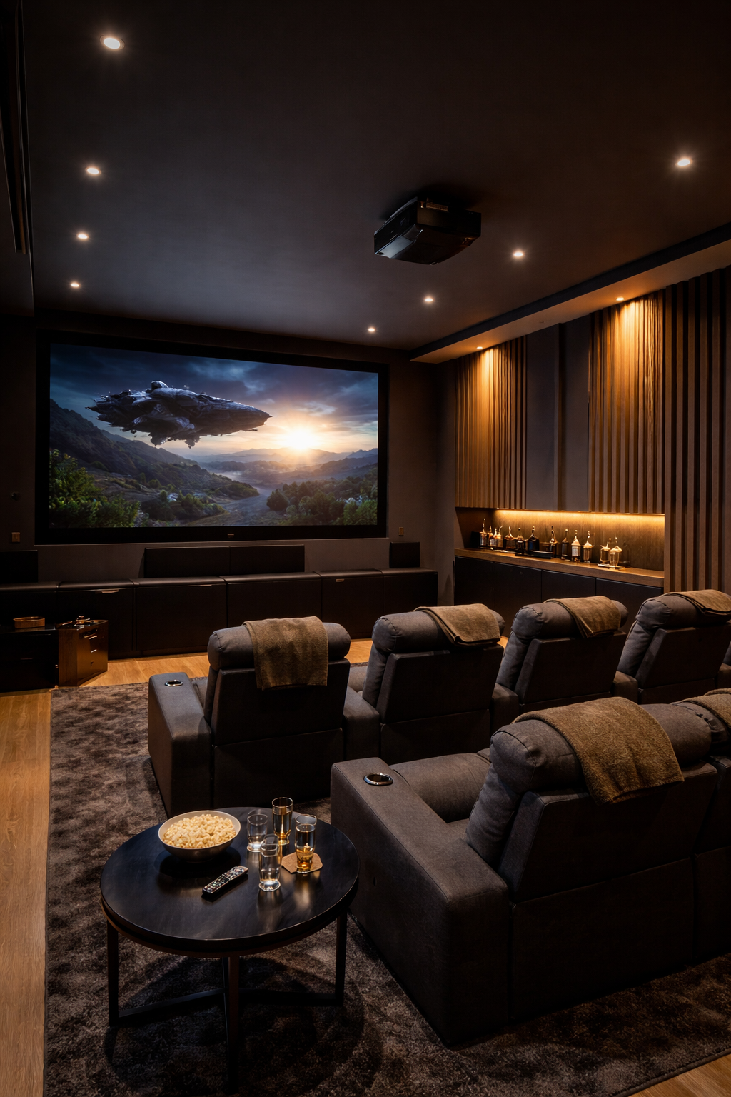 A premium private home theater designed for an immersive cinematic experience, featuring plush recliner seating, ambient mood lighting, a large projection screen, and refined modern interiors that combine comfort, elegance, and high-performance audiovisual design.