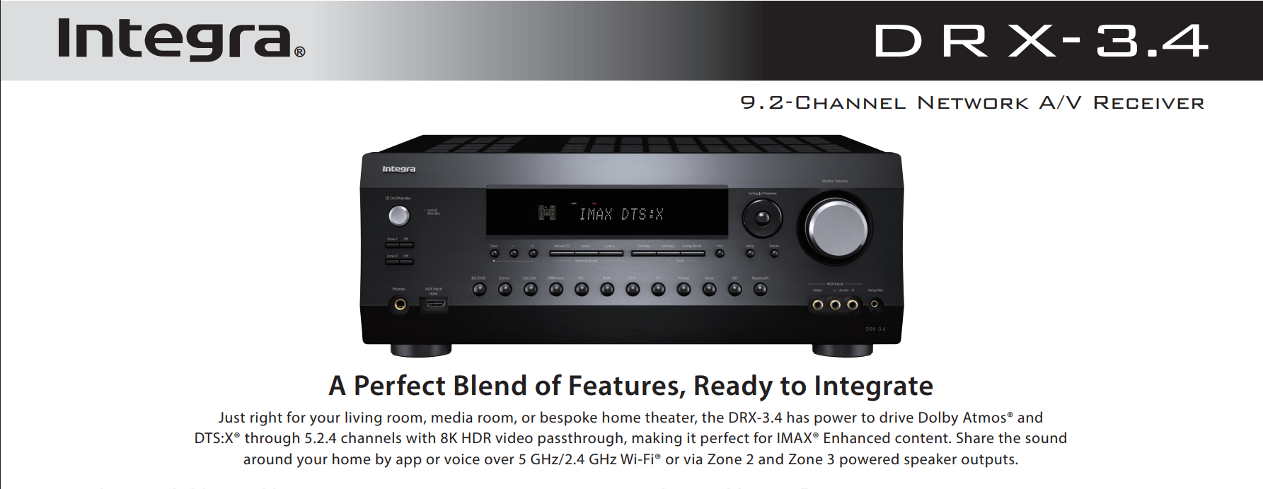 The Integra DRX-3.4 is a next-generation premium AV receiver engineered for advanced home theater and custom installation environments. Designed to deliver powerful, immersive surround sound and cutting-edge video performance, it supports the latest Dolby Atmos® and DTS:X® formats along with HDMI 2.1 connectivity for 8K video. With robust amplification, high-resolution audio processing, and seamless smart-home integration, the DRX-3.4 is an ideal solution for modern, high-performance home entertainment systems.