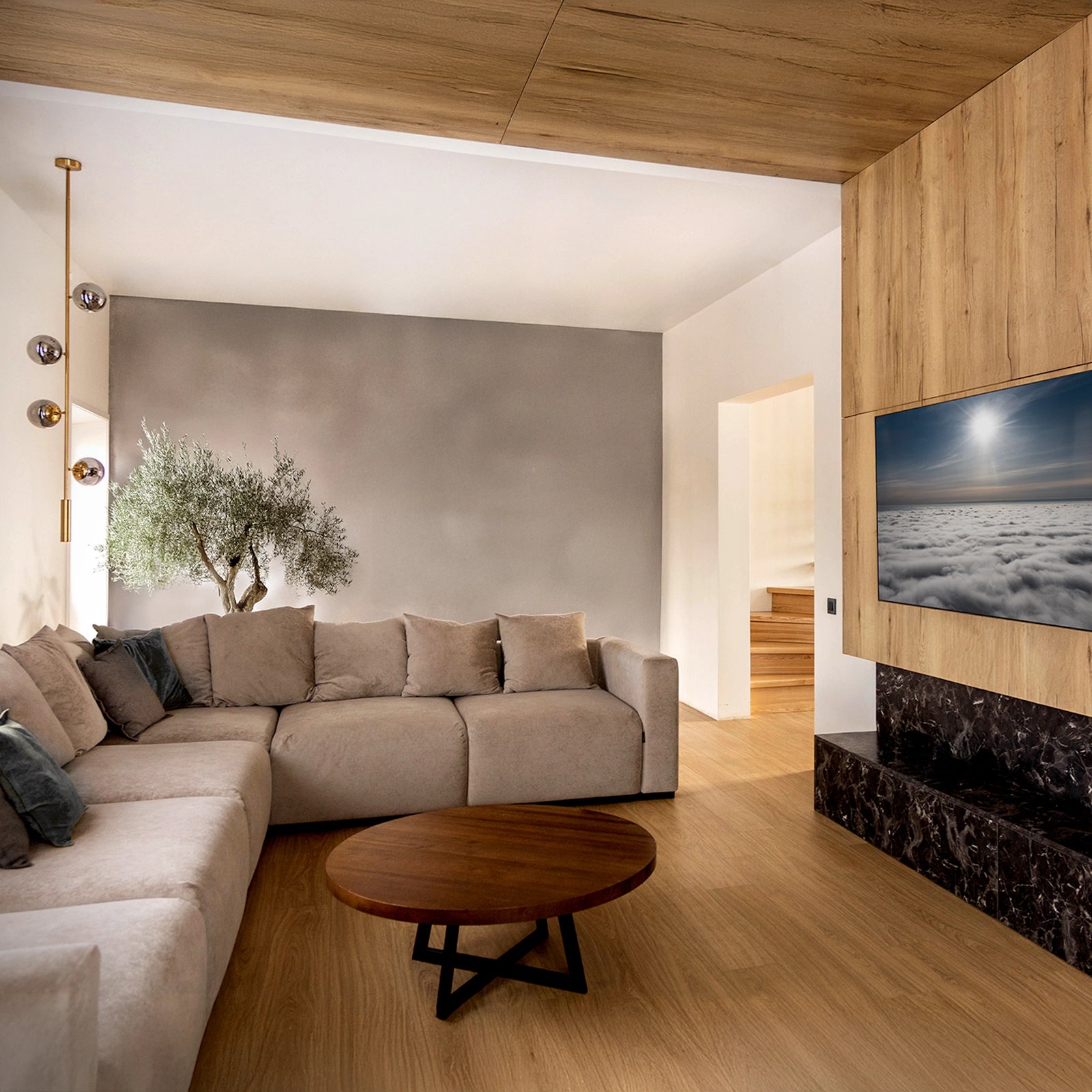 An airy, contemporary living space featuring light wood paneling, neutral-toned sectional seating, warm ambient lighting, and a sleek wall-mounted display, creating a refined and comfortable home entertainment environment.