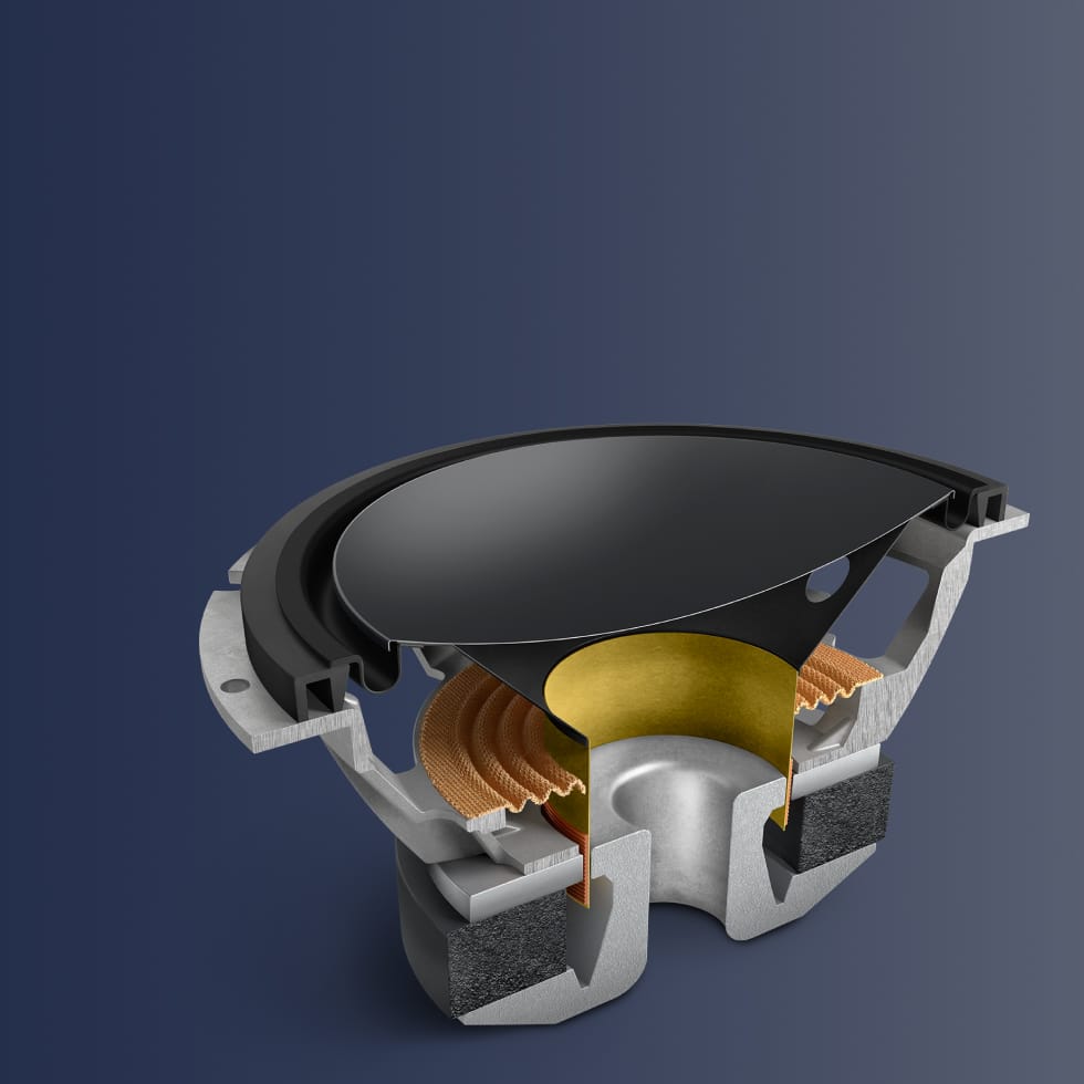Hybrid aluminium bass drivers with greater driver excursion for tight, deep, controlled bass.