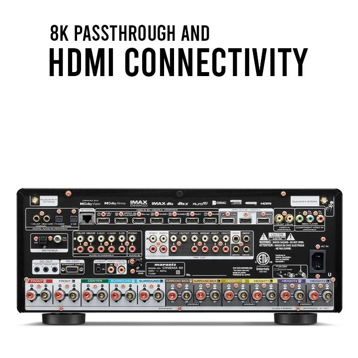 The AVR Cinema 40 Marantz is equipped with multiple HDMI inputs and outputs that include support for 8K passthrough. This feature enables seamless integration withUltra HD Blu-ray players, gaming consoles, and other 8K-capable devices, delivering stunning visuals to complement the exceptional audio performance.