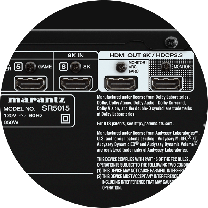 The new Marantz SR5015 includes 6 HDMI inputs and 2 outputs for all your favorite sources. One dedicated 8K input supports 8K/60Hz and 4K/120Hz pass-through capability, 4:4:4 Pure Color sub-sampling, Dolby Vision, HLG, HDR10, 21:9 video, 3D and BT.2020 pass-through. Additionally, the latest HDCP 2.3 copy protection standard is supported on all HDMI inputs.