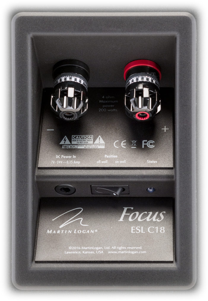 The Focus ESL C18 is also at home on a shelf or floor stand. Toggle the convenient “On-Wall/Off-Wall” acoustic contour switch to instantly optimize performance for any mounting position. This feature automatically modifies response to compensate for wall boundaries that may reinforce or inhibit bass output. The result is room-filling center channel reproduction with lifelike full-range verve.