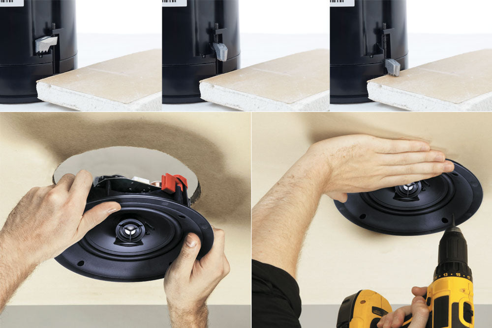 A simple, yet robust mounting-lock system allows quick, trouble-free installation. Pocketed screw holes help hold the drill steady, making installation a snap. When not in use, mounting locks are held securely within a self-contained housing. When moved into place, they couple the chassis firmly to the ceiling or wall, increasing the rigidity of surfaces. If ever removed, the locks retract and latch back in their housings. Each speaker includes a full-size installation template featuring quick-reference instructions, and die-cut guides for marking the cutout hole.