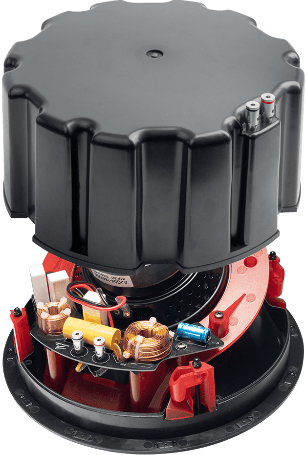 All Motion CI in-ceiling speakers have the option for a retrofittable back can or enclosure. This helps contain the sound coming off the back of the speaker to dramatically reduce unwanted sound that can travel through the floor and up into the living space above the speaker. For those desiring increased bass output, or for when sound control is not required, you can simply choose to use the MC6-HT without the optional enclosure so it can take full advantage of the larger air volume provided by the space in the ceiling.