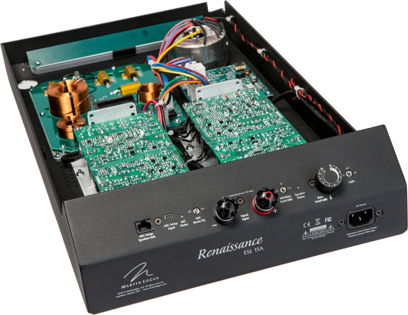 The performance of Renaissance ESL 15A has been reconsidered from the ground up. Taking full advantage of innovations like PoweredForce Forward and ARC Technology, and the integration of the electrostatic panel with the woofer array, required daring thinking about power and efficiency. Our new dual 500-watt amplifiers produce clean power, in a small space, more efficiently than ever before. They enable the effortless delivery of exhilarating dynamic impact, with plenty of overhead. Superior, reliable Class-D technology means there’s virtually no energy lost between the amplifiers and the woofers.The performance of Renaissance ESL 15A has been reconsidered from the ground up. Taking full advantage of innovations like PoweredForce Forward and ARC Technology, and the integration of the electrostatic panel with the woofer array, required daring thinking about power and efficiency. Our new dual 500-watt amplifiers produce clean power, in a small space, more efficiently than ever before. They enable the effortless delivery of exhilarating dynamic impact, with plenty of overhead. Superior, reliable Class-D technology means there’s virtually no energy lost between the amplifiers and the woofers.