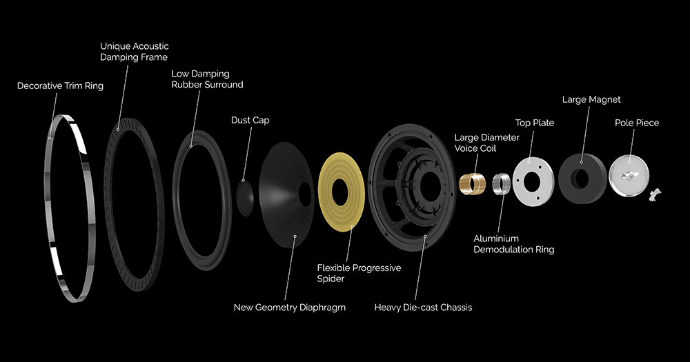 The designers settled on a proprietary woven glass fibre matrix, formed into a 150mm cone. This provides a superb combination of low mass and high strength, with the addition of a high-plasticity coating to control its acoustic behaviour. With such a low-mass cone, only a low-damping, foamed, rubber-like material would match the surround – again, coated for durability.