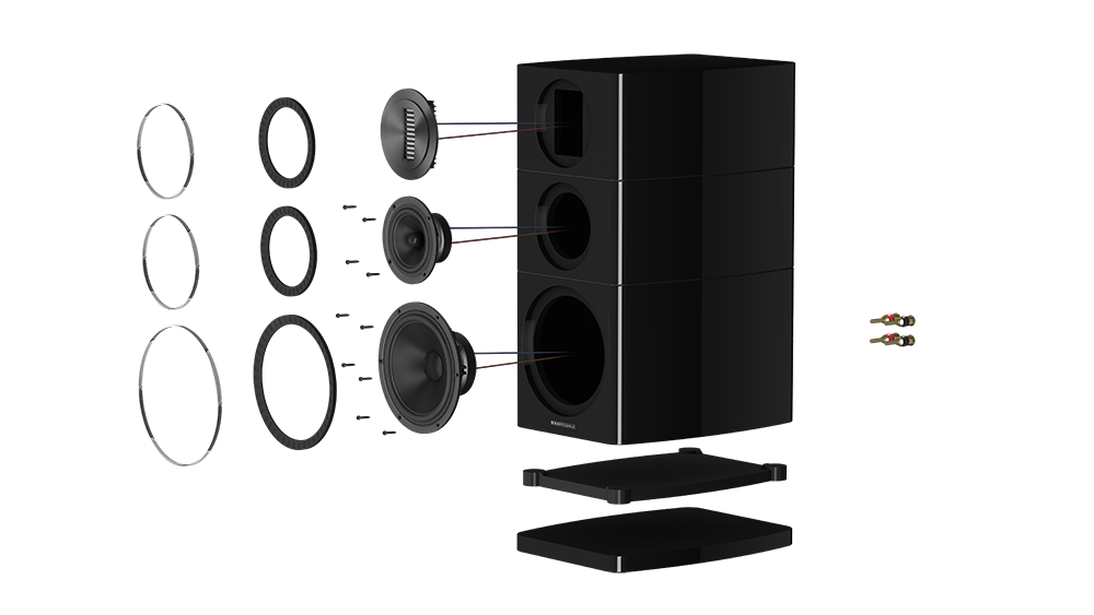 The midrange unit is matched with a glass fibre matrix cone for the bass unit, in this case, terminated with a highly flexible rubber surround and driven by a specially developed low-distortion motor system. Mounted on a die-cast aluminium chassis, the magnet system features an aluminium ring for eddy current control, immersing the 17.5mm long, 38mm diameter voice coil in high flux over 12mm of linear excursion.
