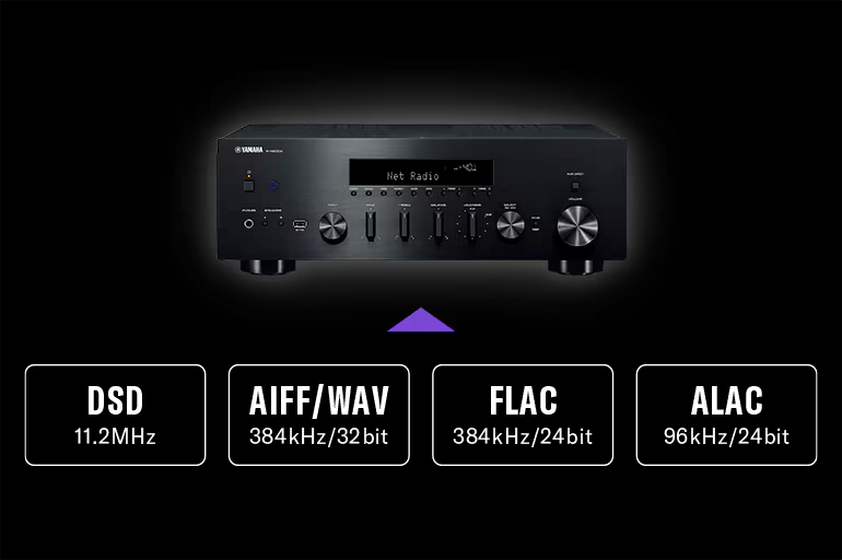 The R-N600A uses the renowned SABRE ES9010K2M 384kHz, 32-bit DAC (from ESS technology) to deliver superior S/N performance. Combined with Yamaha’s original network module, the unit thoroughly draws out all the sonic merits of high-resolution sound sources, effectively reproducing even the subtle ambience of concert halls and delicate expressive nuances in the sound.