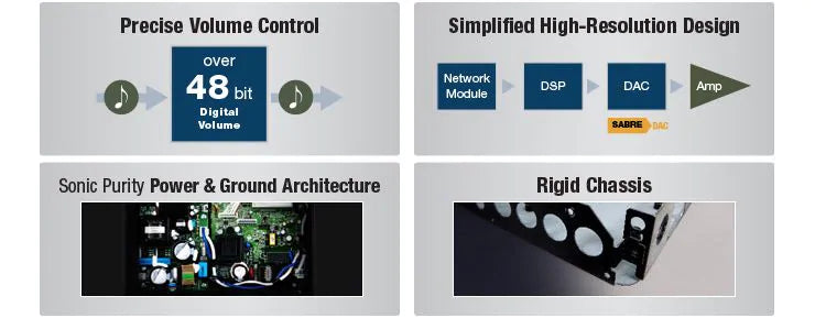 Yamaha’s relentless pursuit of sonic purity is clearly evident in the engineering of the WXA-50. The preamp circuitry uses the same high-performance ESS digital-to-analog converter (DAC) found in high-end Yamaha AV receivers and a proprietary power supply ground configuration prevents sound degradation. A 48-bit digital volume control provides much greater precision and quality than conventional controls. A highly-rigid metal chassis supplies the stability necessary for clear, powerful music reproduction.