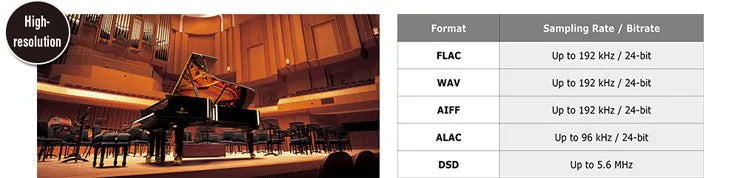 The WXA-50 supports high-resolution audio –including FLAC/WAV/AIFF up to 192 kHz/24-bit, Apple Lossless (ALAC) up to 96 kHz/24-bit and DSD up to 5.6 MHz – for more accurate reproduction of sonic details, presence and atmosphere.