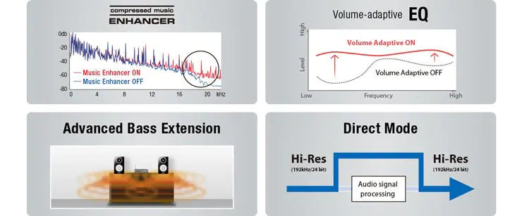 The Compressed Music Enhancer greatly improves sound reproduction from smartphones or other compressed sources, like MP3 files. Volume-adaptive EQ automatically adjusts the bass/treble balance according to the volume level. Advanced Bass Extension Processing provides a deeper, richer low-end sound — great for use with compact or in-wall speakers. Direct playback mode allows you to play back high-resolution audio sources just as they are, without any processing.